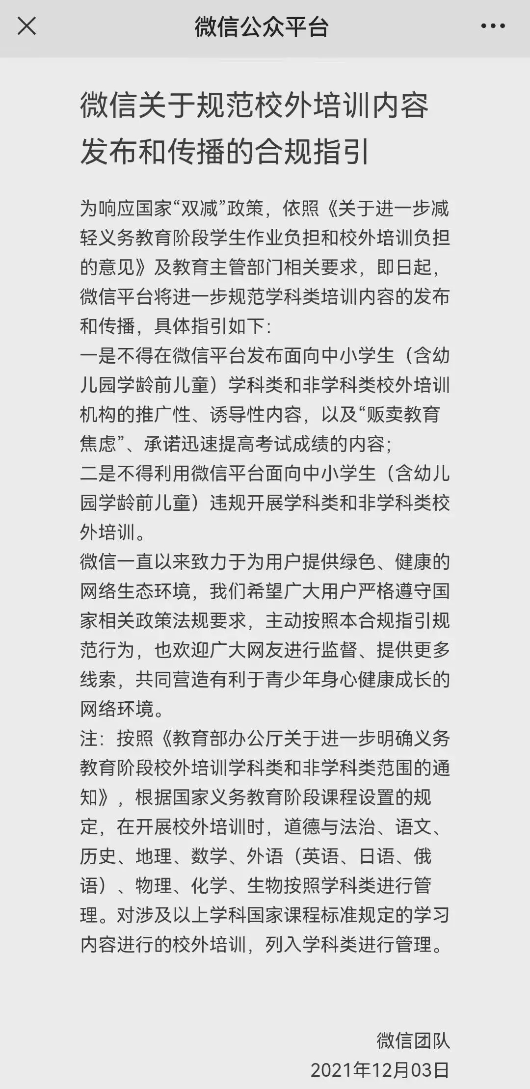 近日,微信团队发布了《微信关于规范校外培训内容发布和传播的合规指引》,要点如下: