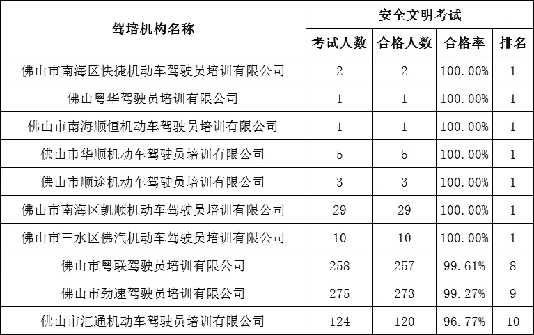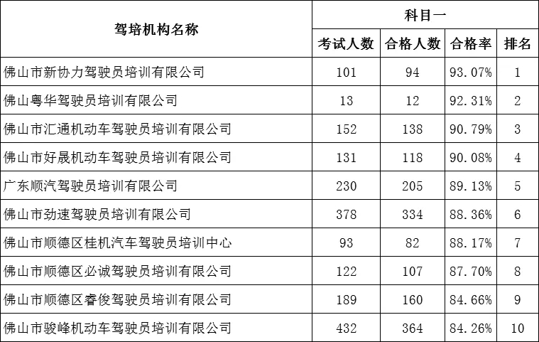 2021年11月佛山市驾驶培训机构考试合格率排名