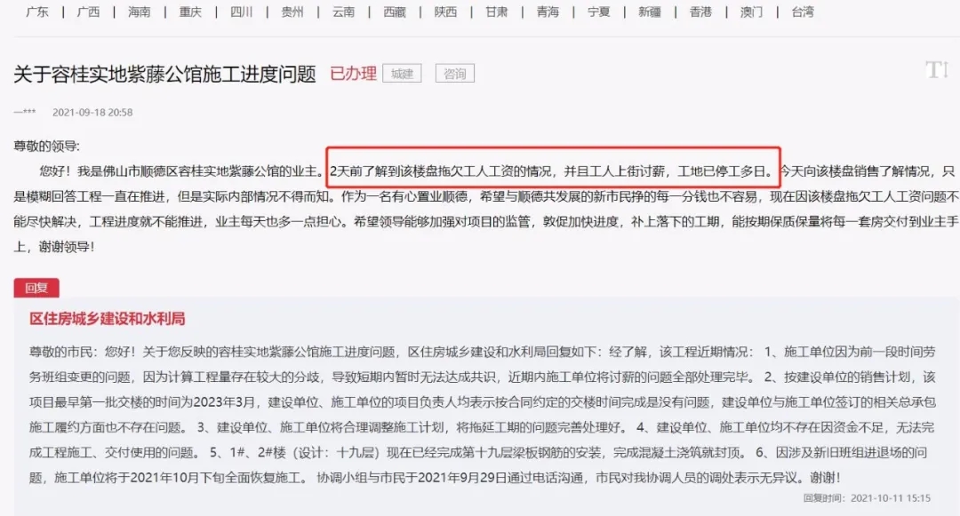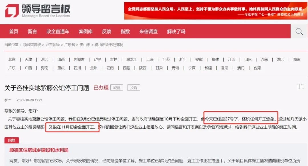 近日,领导留言板上有市民反映,位于顺德容桂的实地紫藤公馆工地已停工,原定11月初全面复工,但似乎进展缓慢。