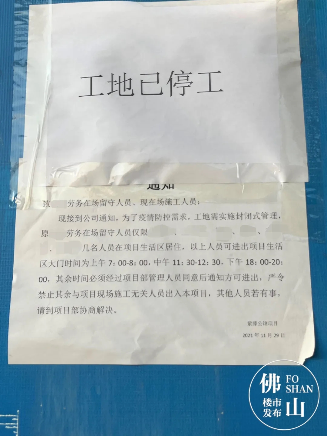 楼市君在项目工地现场留意到,围挡上张贴了停工通知,通知的颁布日期在11月29日,而“工地已停工”的字样在不久前张贴。
