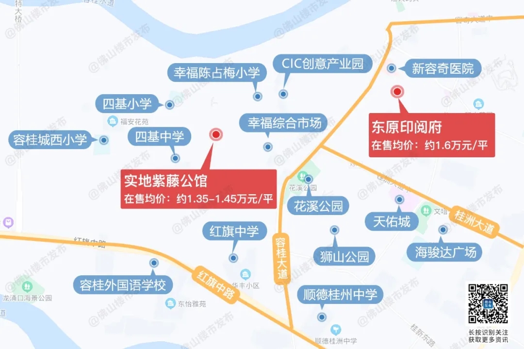 项目位于顺德容桂旧城区西部,周边一手项目较少,生活配套较零散,在售均价约1.35-1.6万元/平。