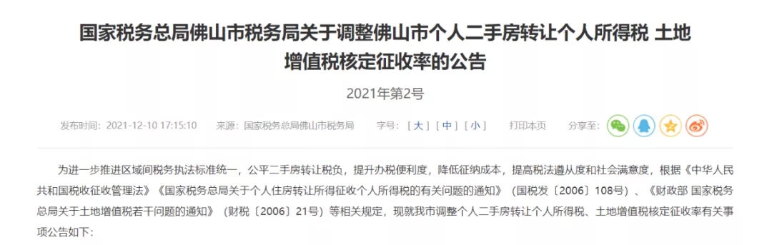 12月10日,佛山市税务局正式出台调整佛山市二手房转让个人所得税、土地增值税核定征收率的公告。