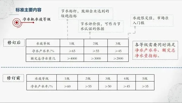 新版水效标准规定了净水机的水效限定值及等级、技术要求和试验方法。主要体现在8个方面,其中水效等级指标的修订十分重要。