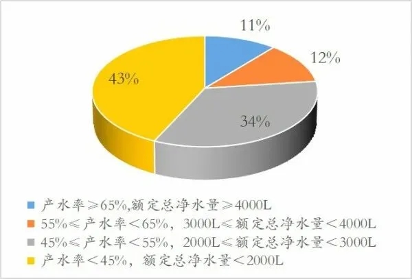原国标《反渗透净水机水效限定值及水效等级》将水效等级分为5级,指标只有净水产水率,最低的第5级为≥35%,即1升自来水净化后产生350毫升净水,最高1级水效的净水产水率≥60%。新修订的水效国家标准水效等级包括净水产水率和额定总净水量这两个指标,各3级,最低的3级水效净水产水率≥45%,且额定总净水量≥2000升;最高的1级水效净水产水率≥65%,且额定总净水量≥4000升。