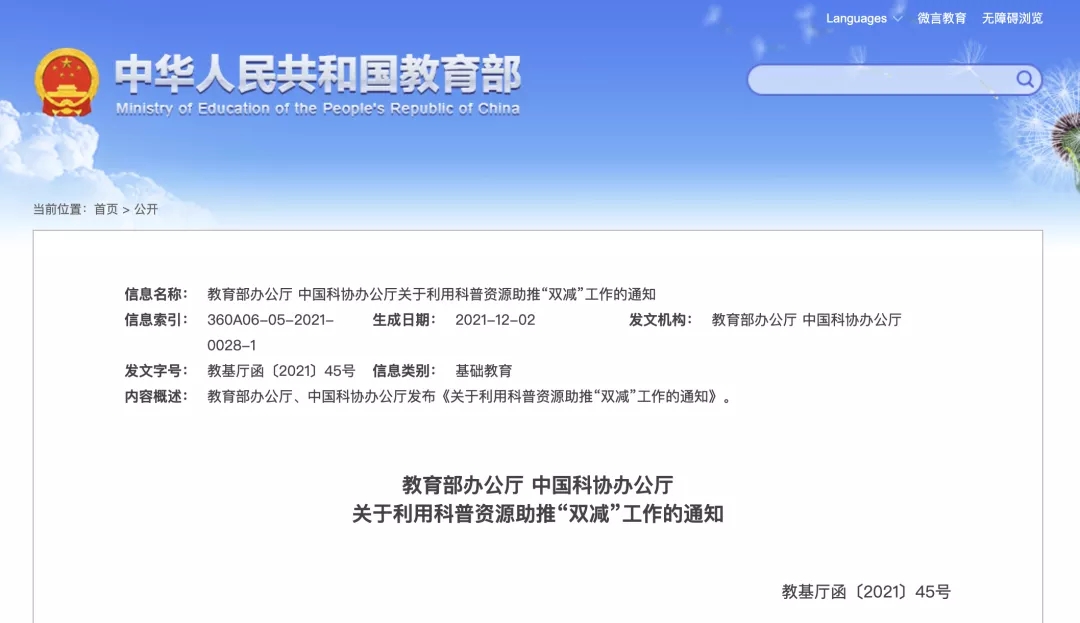 近日,教育部办公厅、中国科协办公厅发布《关于利用科普资源助推“双减”工作的通知》。