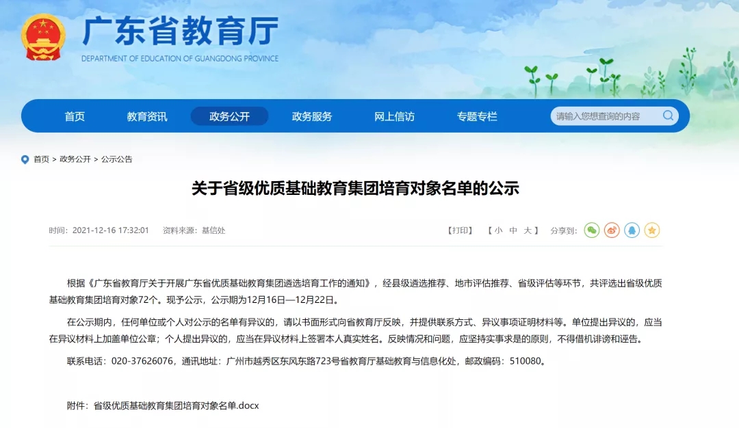 去年8月,广东省教育厅、广东省委机构编制委员会办公室、广东省财政厅、广东省人力资源和社会保障厅联合下发《关于推进中小学幼儿园集团化办学的指导意见》,明确组建跨市域、跨县域的教育集团,实现优质教育资源利用效益最大化。到2022年全省建立形成中小学幼儿园集团化办学的良好发展态势,培育创建不少于100个省级优质特色教育集团,充分发挥省级优质特色教育集团的辐射带动作用。每个地市至少创建2个省级优质特色教育集团,设立一批有特色、有影响的本地优质教育集团。