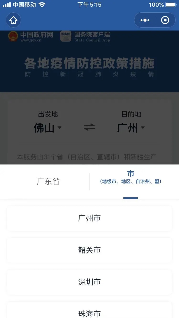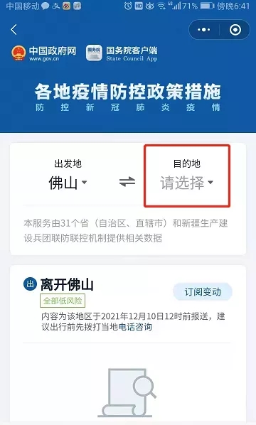 02、搜索“各地疫情防控政策措施”,输入“出发地”“目的地”了解情况。