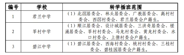表2:2021年北滘镇公办初中转学插班对应学区范围一览表