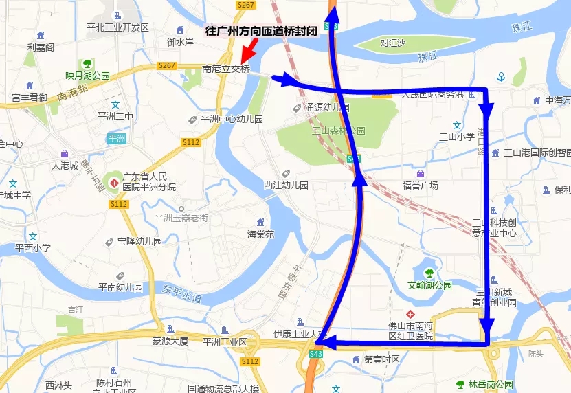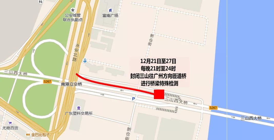 为保证匝道桥的桥梁整体结构安全及途经车辆的行车安全,南海区公路管理站于2021年12月21日至12月27日(共7天),每天21时至24时对三山西桥(三山往广州方向匝道桥)进行桥梁特殊检测,检测时需对该匝道桥临时封闭,请途经车辆提前绕道港口路、广珠西线往广州行驶。