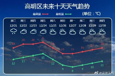 预计我区未来十天前期有阴雨天气;后期受新一股冷空气影响,多云为主,气温下降。具体预报:21日阴天,有小到中雨,12到18度;22到23日阴天到多云,局部有零星小雨,13到20度;24日多云到阴天,15到21度;25到26日多云间阴天,9到18度;27到30日多云间晴,8到18度。