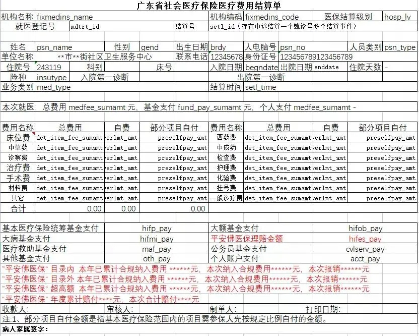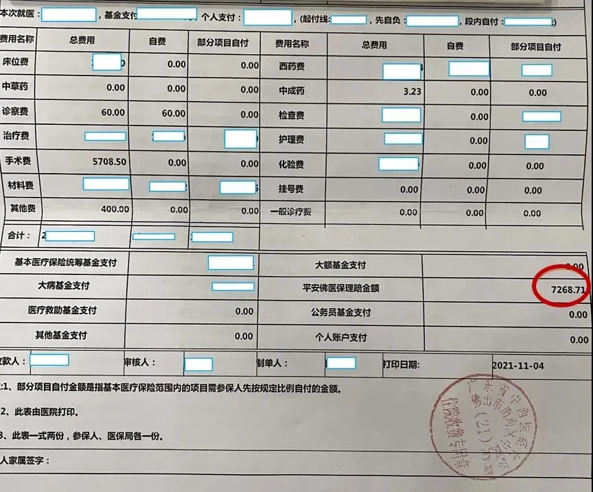 我们一起来看一个真实的案例,上面清晰的显示就医总费用、各类别费用、医保报销费用等内容,还有就是:“平安佛医保”理赔金额也会展示在结算单这一行中。