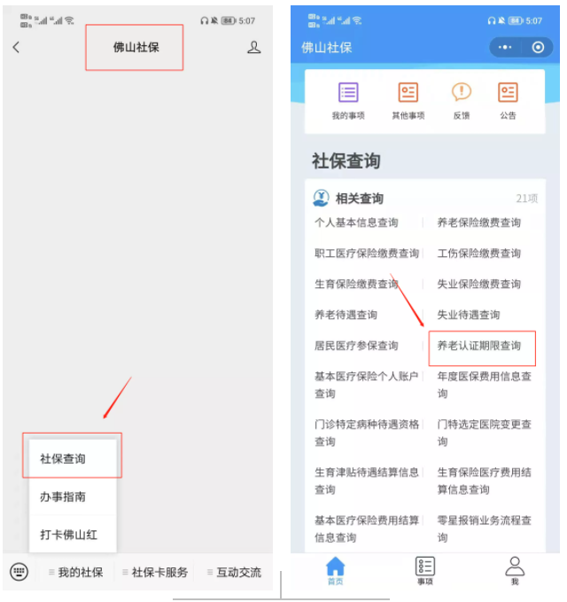 进入“佛山社保”微信公众号,点击底部菜单栏“我的社保”→“社保查询”→“养老认证期限查询”,随后进入页面按提示操作即可。