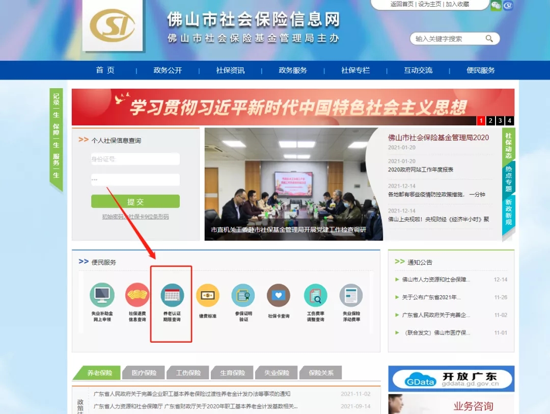 登录“佛山市社会保险信息网”,点击“便民服务”栏目的“养老认证期限查询”,进入页面,输入身份证号码和验证码即可。