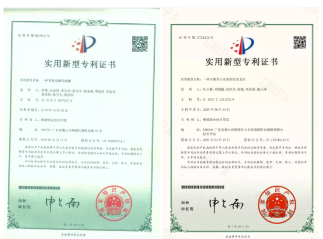 学生邓韵贞、苏志炎参与彭莺、吴治将老师负责的技术研发项目,并成功申请了《一种节能电梯用按键》实用新型专利证书;学生陈挺参与庄少彬、刘锦鑫老师负责的技术改造项目,并成功申请了《一种可调节出水量角度水龙头》实用新型专利证书。