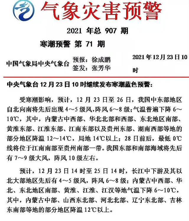 23日上午寒潮已到达内蒙古,预计其前锋将于24日夜间到达粤北,25日自北向南影响我省,气温开始下降;26日-27日,寒潮主体进一步南下,中南部市县有中到大雨,粤北高寒山区有雨夹雪或冻雨,各地气温持续下降,过程日平均气温下降8℃~11℃;我省陆地和江河湖面将有6级~8级阵风。