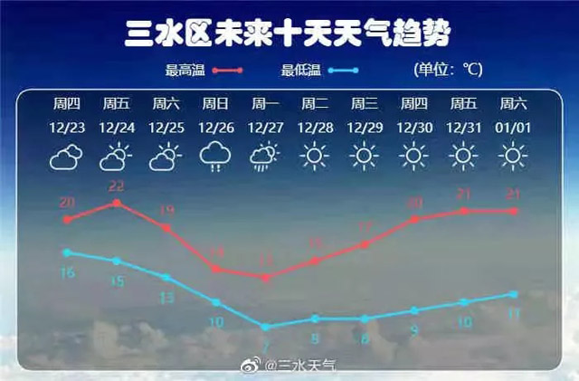 【三水十天天气】预计,23日阴天间多云;24到25日多云间阴天;26日多云到阴天,有小雨;27日小雨转多云;28到29日晴间多云;展望30日到1月1日晴朗干燥。早晚寒凉,昼夜温差大,需注意适时增减衣物。三水区气象台2021年12月23日8时30分发布