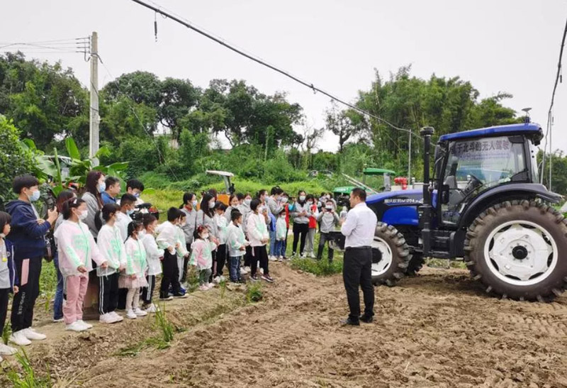 在高明区更合镇吉田村,钟志强正在向亲子研学团讲解无人驾驶拖拉机功能。