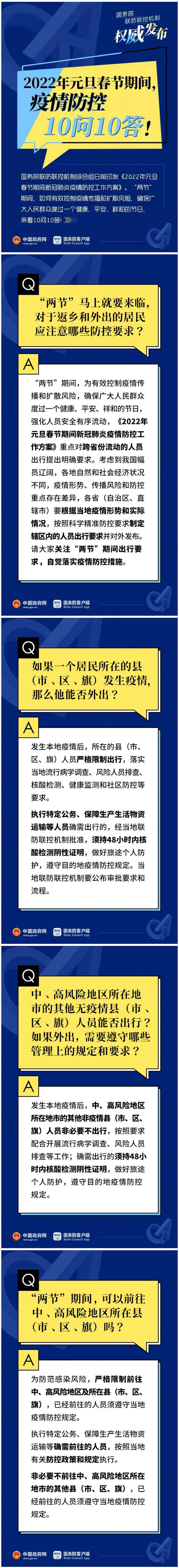 国务院联防联控机制综合组日前印发《2022年元旦春节期间新冠肺炎疫情防控工作方案》。“两节”期间,如何有效控制疫情传播和扩散风险,确保广大人民群众度过一个健康、平安、祥和的节日,来看10问10答!