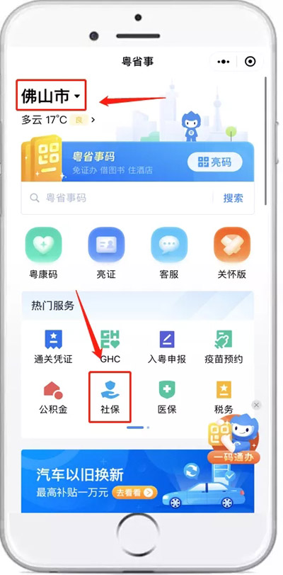 1、微信搜索“粤省事”小程序,进入小程序首页左上角切换城市为佛山市,选择“社保”服务板块(如未关联社保卡可按照页面提示关联社保卡)。