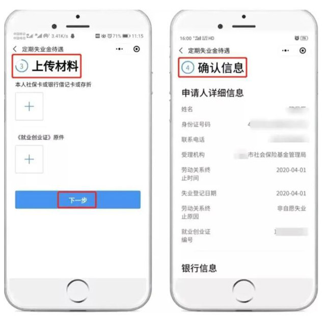 5、校验通过,进入填写信息页面,系统通过数据比对自动获取联系电话、劳动关系终止原因、银行账户等信息。