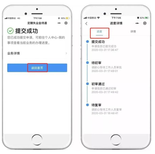 7、提交成功后即完成业务申报。如需查询业务办理情况可点击“业务详情”进入进度详情页面,如需办理其他业务可点击“返回首页”按钮返回首页。