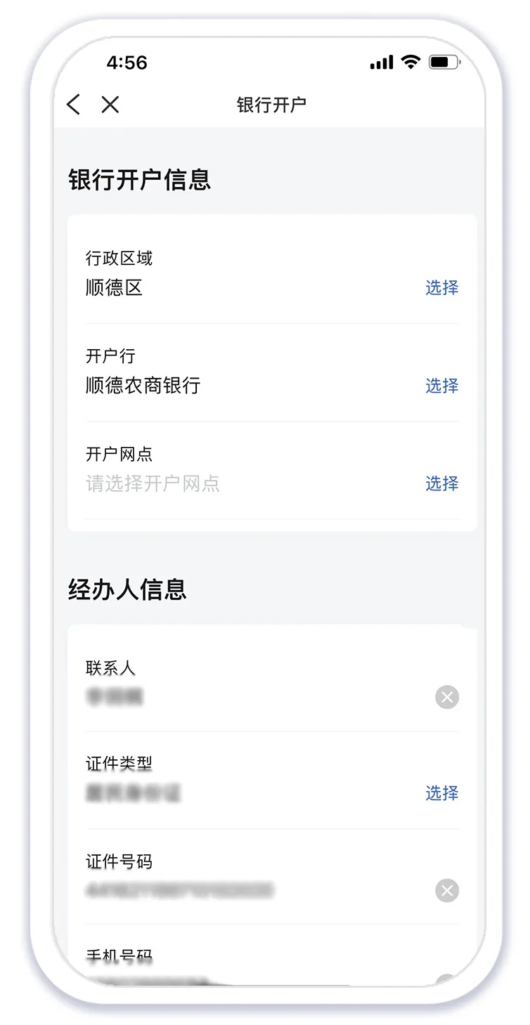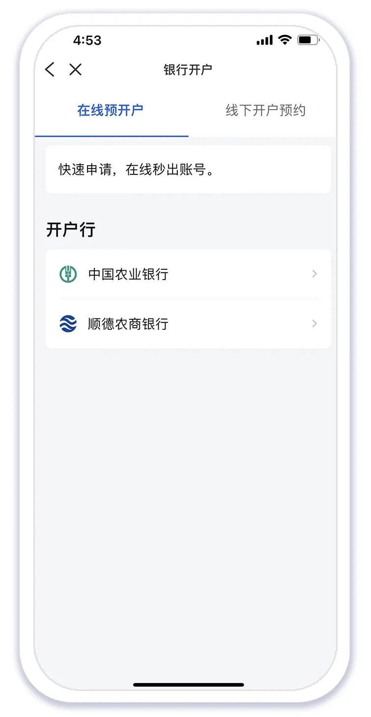 用户只需选择行政区域、开户行、开户网点,即可完成在线预开户/预约线下银行开户。