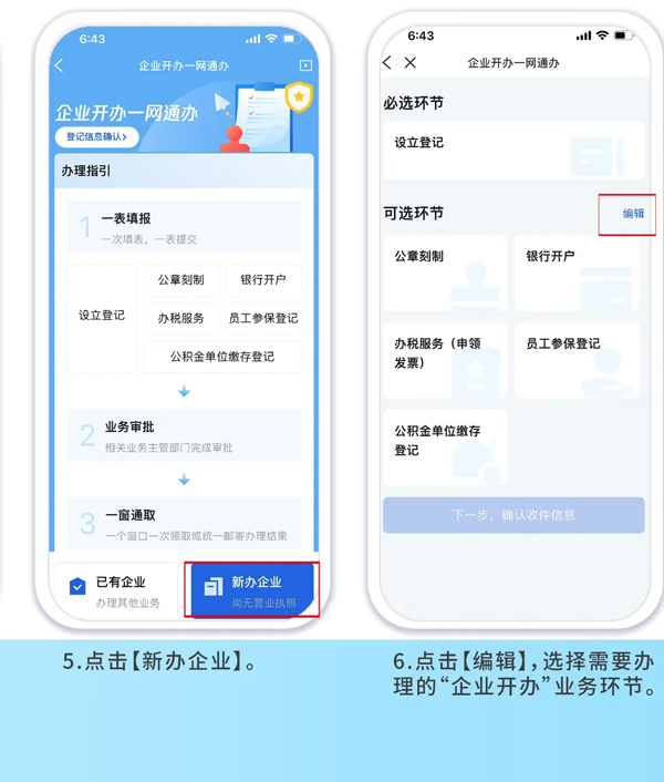 登录粤商通APP,选择新开办企业所在城市,点击【开公司】,进入企业开办一网通办页面,选择需要一次办理的企业开办业务环节后,按要求填写资料,提交企业设立登记申请。