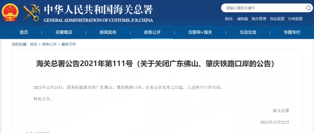 据海关总署网站22日消息,海关总署公告,2021年12月15日,国务院批准关闭广东佛山、肇庆铁路口岸。自本公告发布之日起,上述两个口岸关闭。