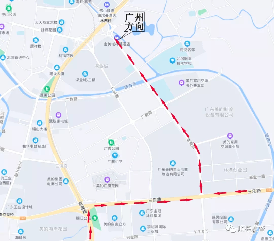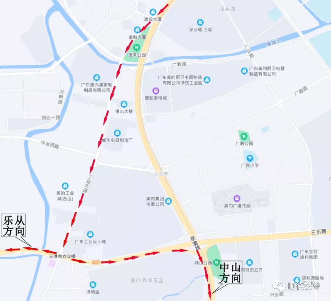 ■ 封闭G105国道建设南路路口(广州往中山)方向,往中山方向的车辆,需经G105建设南路路口→蓬莱一路→工业大道→三乐路→三乐路乐从方向或G105国道方向绕行。