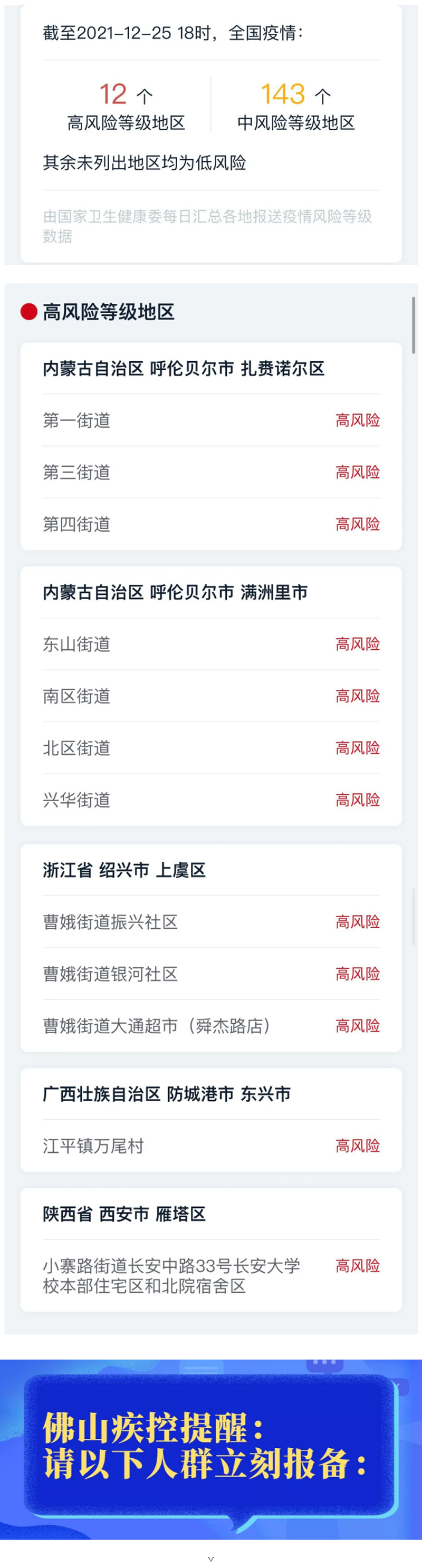 据国务院客户端显示,截至12月25日18时,全国共有12个高风险地区,143个中风险等级地区。