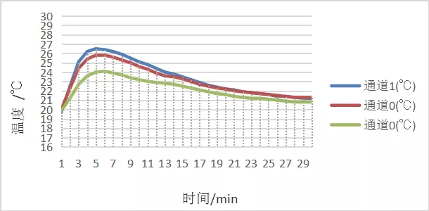 该样品吸湿发热测试中最高升温值为 6.3℃,30min 内平均升温值为 3.4℃,符合标准要求,可称之为具有吸湿发热性能。