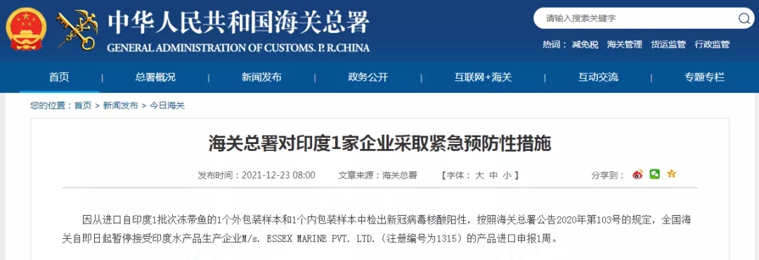 据海关总署网站12月23日消息,因从进口自印度1批次冻带鱼的1个外包装样本和1个内包装样本中检出新冠病毒核酸阳性,按照海关总署公告2020年第103号的规定,全国海关自即日起暂停接受印度水产品生产企业M/s. ESSEX MARINE PVT. LTD.(注册编号为1315)的产品进口申报1周。
