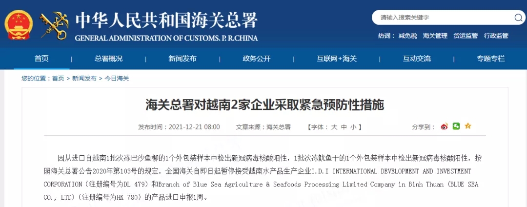 据海关总署网站12月23日消息,因从进口自越南1批次冻巴沙鱼柳的1个外包装样本中检出新冠病毒核酸阳性,1批次冻鱿鱼干的1个外包装样本中检出新冠病毒核酸阳性,按照海关总署公告2020年第103号的规定,全国海关自即日起暂停接受越南水产品生产企业I.D.I INTERNATIONAL DEVELOPMENT AND INVESTMENT CORPORATION(注册编号为DL 479)和Branch of Blue Sea Agriculture & Seafoods Processing Limited Company in Binh Thuan (BLUE SEA CO., LTD)(注册编号为HK 780)的产品进口申报1周。