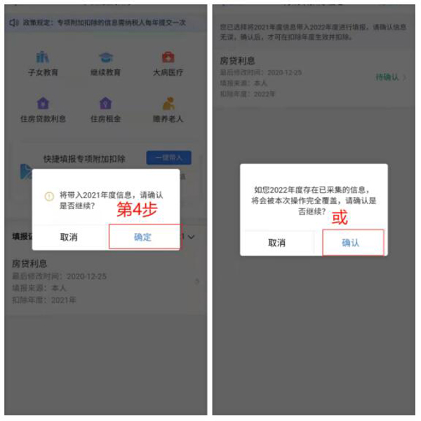 ②依据提示“将带入2021年度信息,确认是否继续?”或者“您在2022年度已存在专项附加扣除信息。如果继续确认,将覆盖已存在的专项附加扣除信息!”,确认后点击确定。