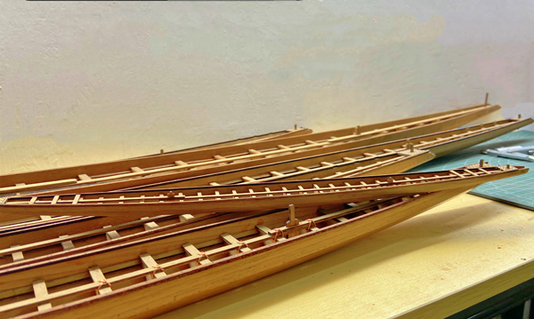叠滘龙船长约25米,龙船模型就按真船的1:25比例进行缩小还原,虽然比例缩小了,但制作工序却没有减少。一条龙船模型由上百个零件制作而成,主要的零件是底骨、大旁、舱板、坐板和花旁,每一份零件都由廿四坊文创社成员用手工进行还原,追求和大船一样的装嵌过程。