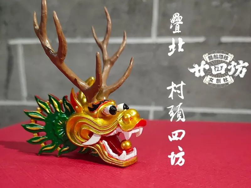 最精细的部分还要数还原龙船的龙头龙尾。还原龙头的基础是神似,造型上一定要捕捉到龙头威武凶猛的神态。制作龙头最大的难度是下刀,手必须要稳定,不能大刀阔斧地下刀,只能慢慢一刀一笔地精雕细琢,追求每一个细节的还原度。上色时,用色也要和真龙头一样,用画笔一笔一画地进行手涂。除了龙头龙尾,还有鼓、锣、头牌、罗伞、彩旗等配件,廿四坊文创社也会真实地还原到模型上。