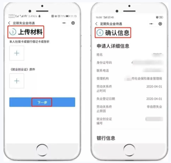 5、校验通过,进入填写信息页面,系统通过数据比对自动获取联系电话、劳动关系终止原因、银行账户等信息。