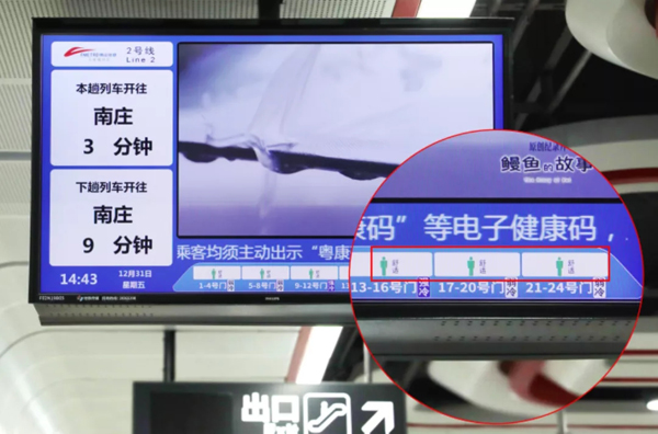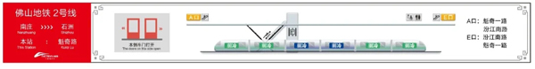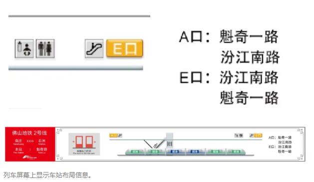佛山地铁2号线一期列车车门上方屏幕,不仅显示线路到站信息还可以看到各个站点和所在位置的出入口信息、卫生间、母婴室、垂直电梯、电扶梯位置。