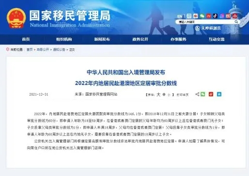 据中华人民共和国出入境管理局政府网站消息,2022年,内地居民赴港澳地区定居夫妻团聚类审批分数线为146.1分,即2018年12月31日之前夫妻分居;子女照顾父母类审批分数线为60分,即申请人年龄为18至59周岁,在香港或者澳门定居的父母年龄均为60周岁以上且在香港或者澳门无子女;子女投靠父母类审批分数线为1分,即申请人未满18周岁,父母均在香港或者澳门定居;父母投靠子女类审批分数线为1分,即申请人年龄为60周岁以上且在内地无子女,需要投靠在香港或者澳门定居的18周岁以上子女。