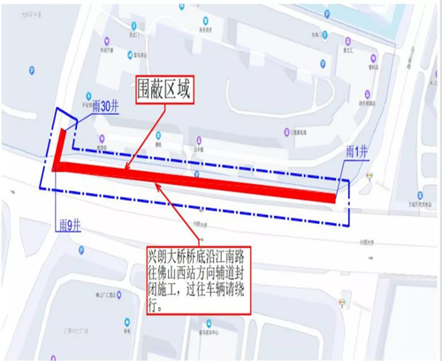 据相关部门介绍,沿江南路往罗村大道佛山西站方向辅道需破除路面结构开挖施工,考虑到机械开挖施工面较大,施工期间会对行车造成安全隐患,故施工期间,沿江南路往罗村大道佛山西站方向辅道全封闭施工。