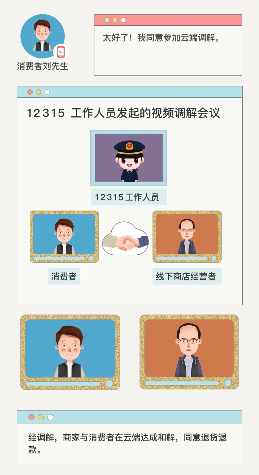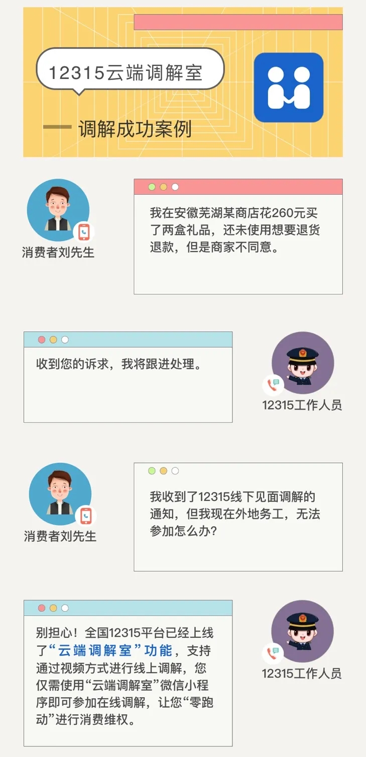 2021年8月起,河北、吉林、安徽、广东等地对全国12315移动工作平台进行了试用。各地运用云端调解室,有了不少线上异地调解的成功案例!?