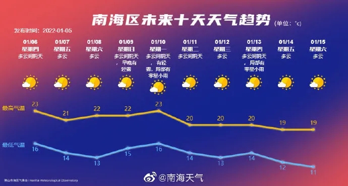 据@南海天气 消息,预计,6日受弱冷空气影响,多云间阴天,气温略降;7到8日以多云天气为主,早晨最低气温13到14℃;9日云量增多,多云间阴天,早晚有轻雾,气温回升。昼夜温差大、早晚寒凉,请注意适时添减衣物。