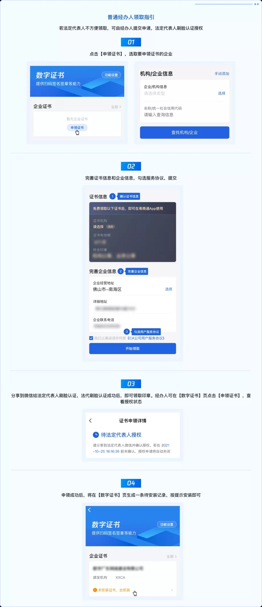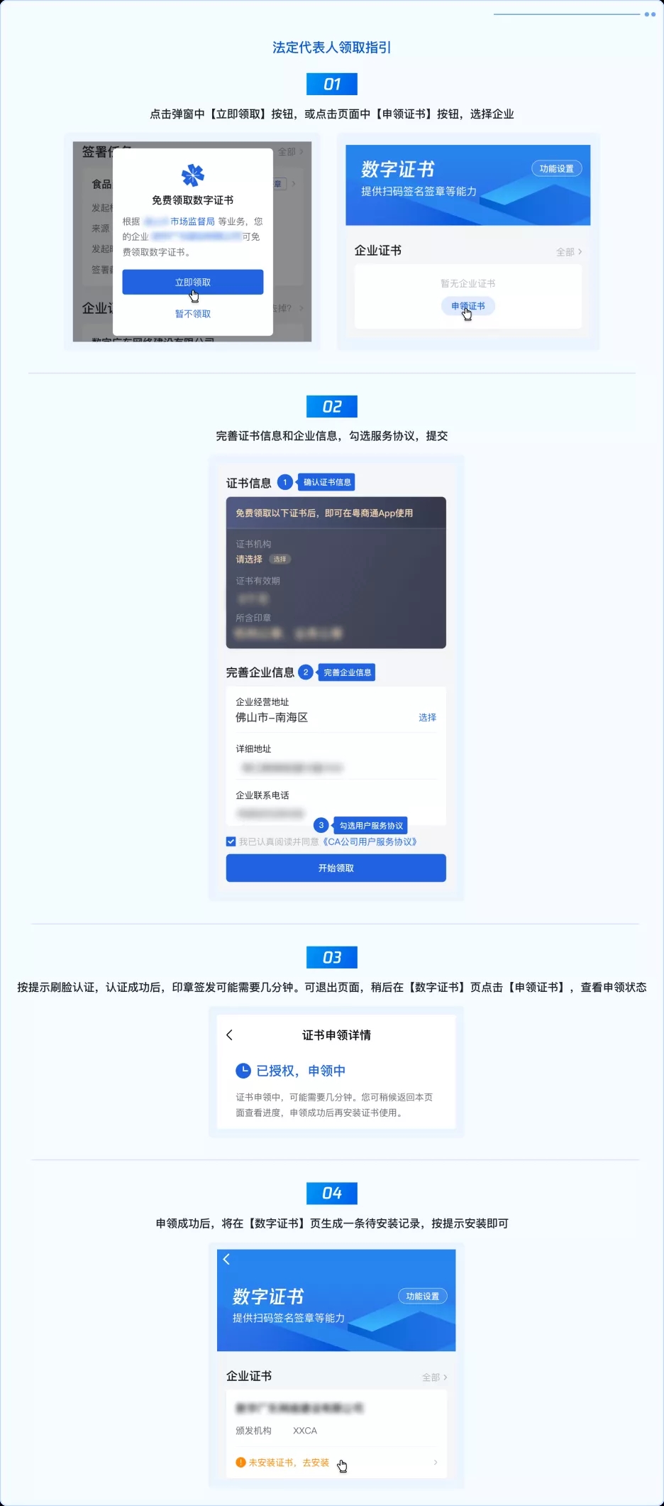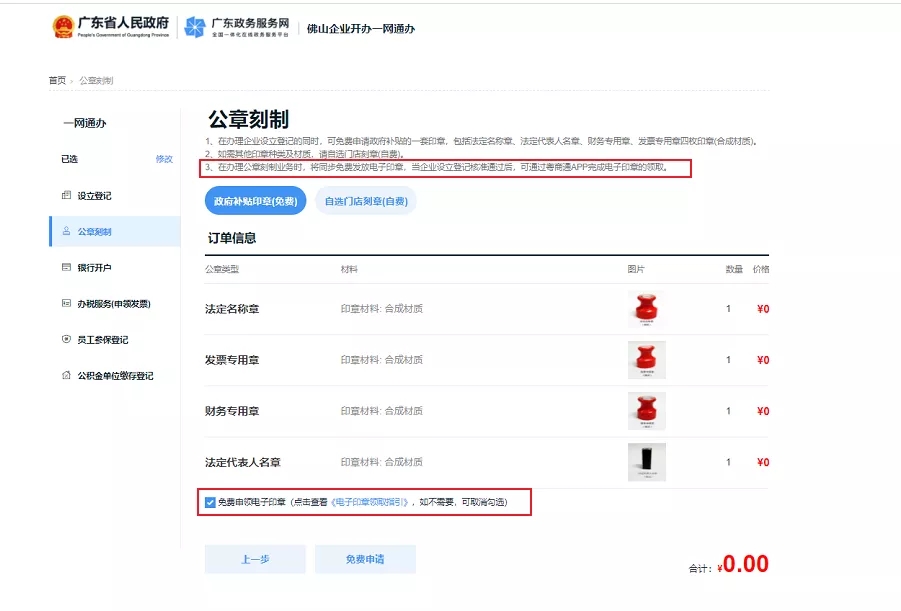 通过“佛山市企业开办一网通办”新办企业的用户,可免费领取的电子印章,包含法定名称章、法定代表人名章、财务专用章。企业法定代表人和经办人均可领取。