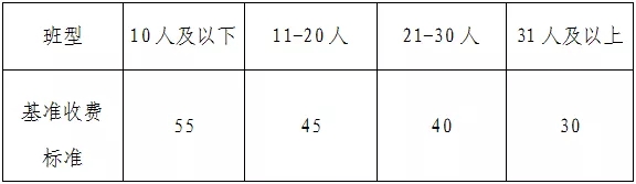 根据政策要求,在成本调查和测算的基础上,综合考虑当前收费水平、学生家庭承受能力、我市经济发展水平以及珠三角其他地市校外培训收费水平等,确定我市线下学科类校外培训基准收费标准为:10人及以下班型为55元/课时·人次,11-20人班型为45元/课时·人次,21-30人班型为40元/课时·人次,31人及以上班型为30元/课时·人次。