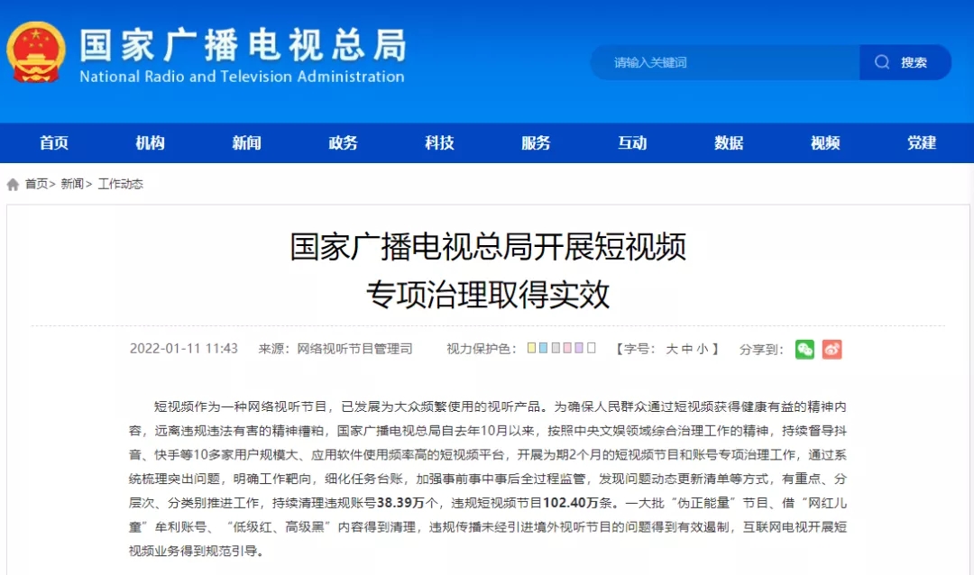 国家广播电视总局1月11日发布公告称,自去年10月以来,国家广播电视总局开展为期2个月的短视频节目和账号专项治理工作,持续清理违规账号38.39万个,违规短视频节目102.40万条。一大批“伪正能量”节目、借“网红儿童”牟利账号、“低级红、高级黑”内容得到清理,违规传播未经引进境外视听节目的问题得到有效遏制,互联网电视开展短视频业务得到规范引导。