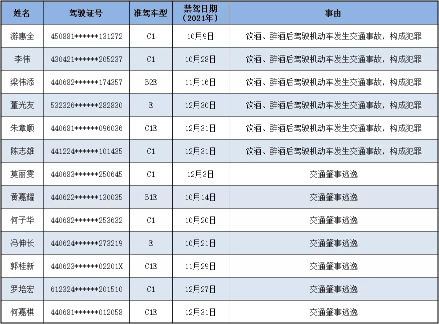 2021年第四季度终生禁驾名单