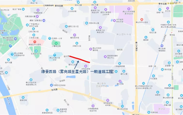 绿景西路(雾岗路至星光路)一期道路工程位于佛山市禅城区石湾镇街道内,路线呈东西走向,路线全长约426m,红线宽度19m,标准段为双向2车道,新建沥青路面,远期设计速度50km/h(近期设计速度30km/h)。本项目于2020年12月25正式开工,于2021年12月20日完工,12月29日通车。