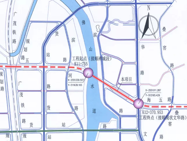 该项目位于南海区与禅城区交界处,起点位于桂城海五路与文华北路交叉口,终点与海五路西延线(禅城段)相连接。新建道路全长615.95米,设置佛山水道大桥1座长360米,主线双向6车道,采用一级公路技术标准兼顾城市道路功能,路基宽度为50米,设计车速为60公里/时;辅路双向4车道,设计速度为40公里/时。