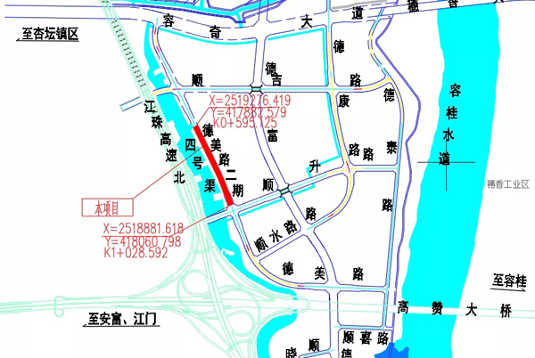 德美路二期道路工程于2020年12月动工,于2021年12月通车。项目位于顺升路以北,高北河以南,规划红线25m,全长443m,南北走向,顺德一中南校区西出口就位于项目范围内,项目包含道路、给排水、照明、交通、绿化等工程内容。