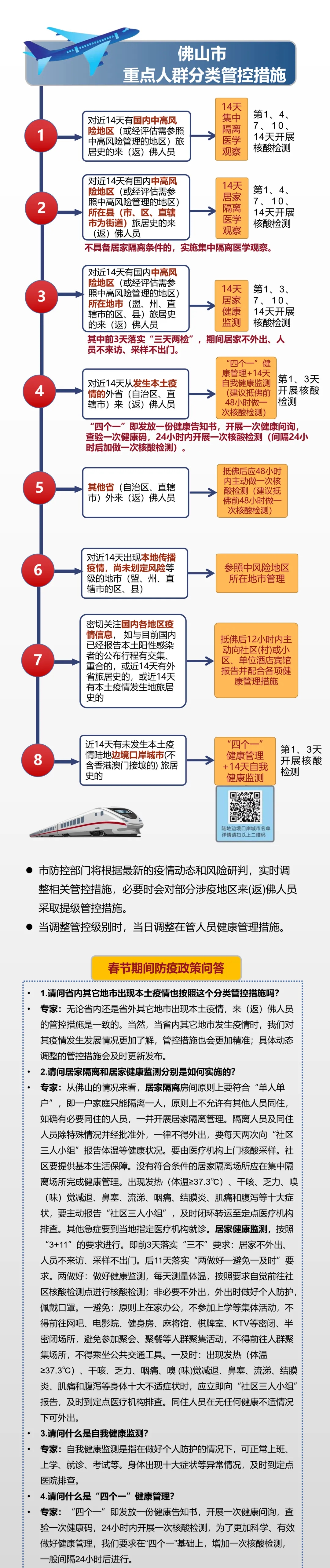 对近14天有深圳/中山/珠海中风险地区旅居史的来(返)佛人员,需集中隔离14天,并在第1、4、7、10、14天开展核酸检测;